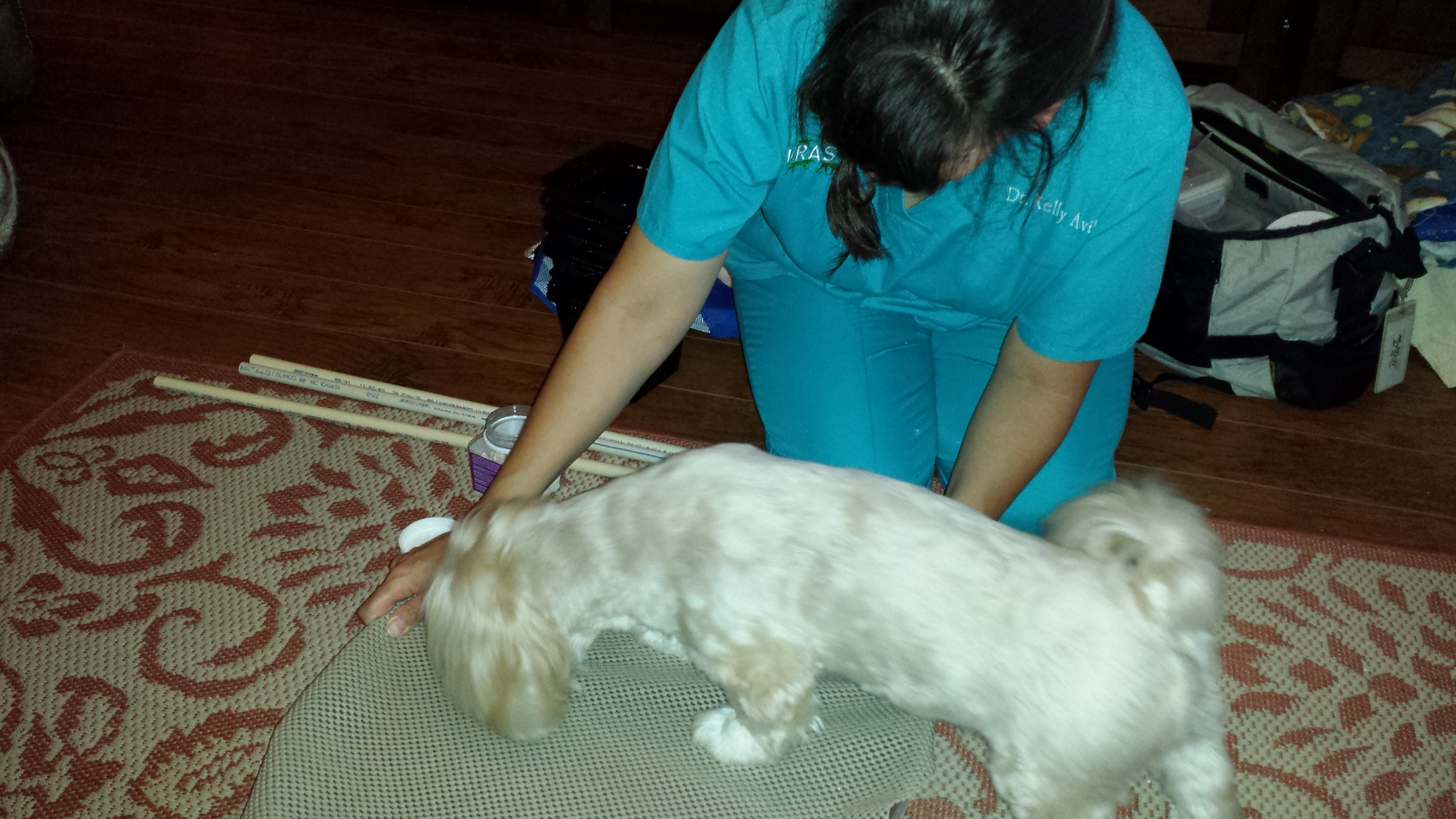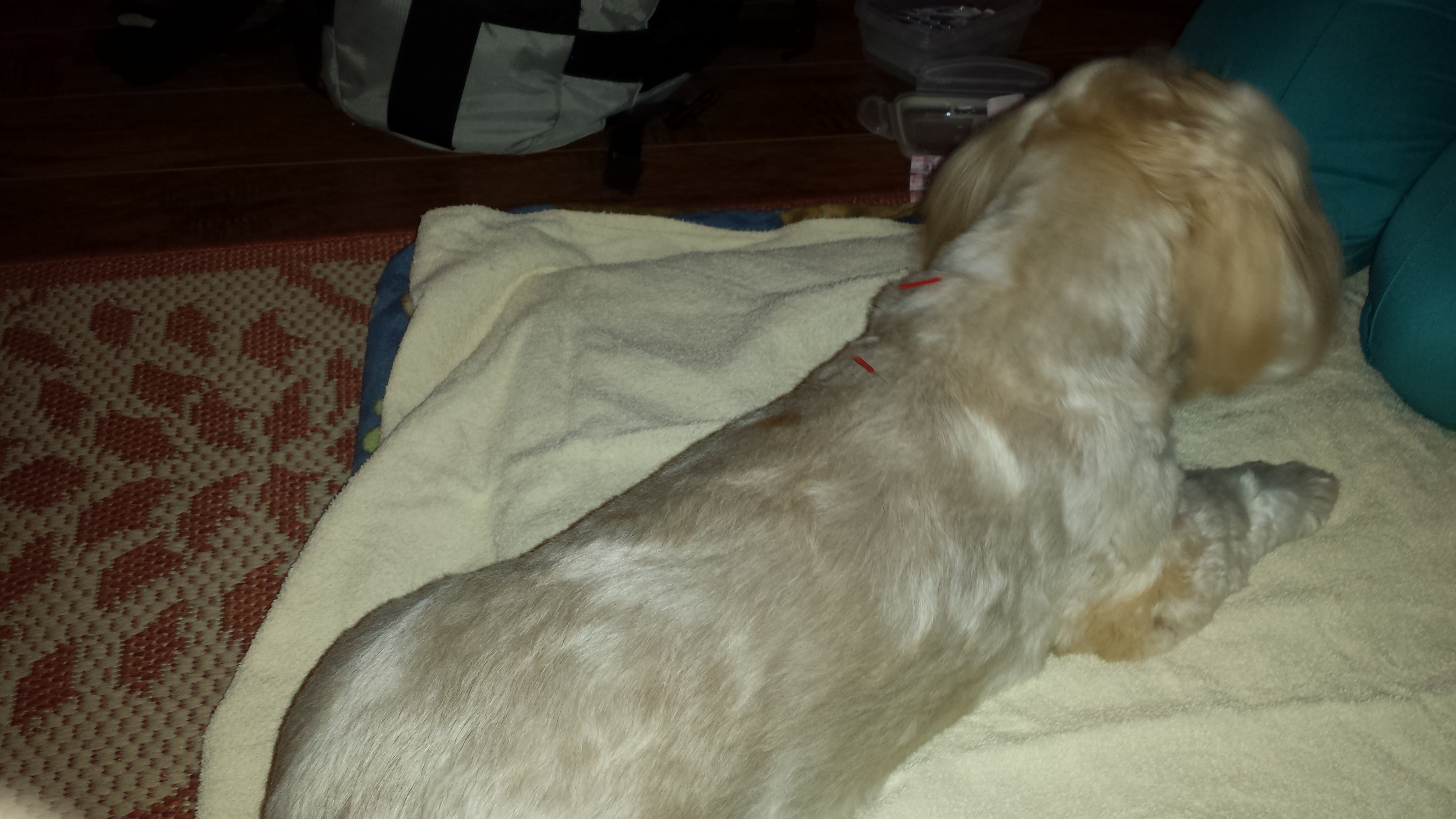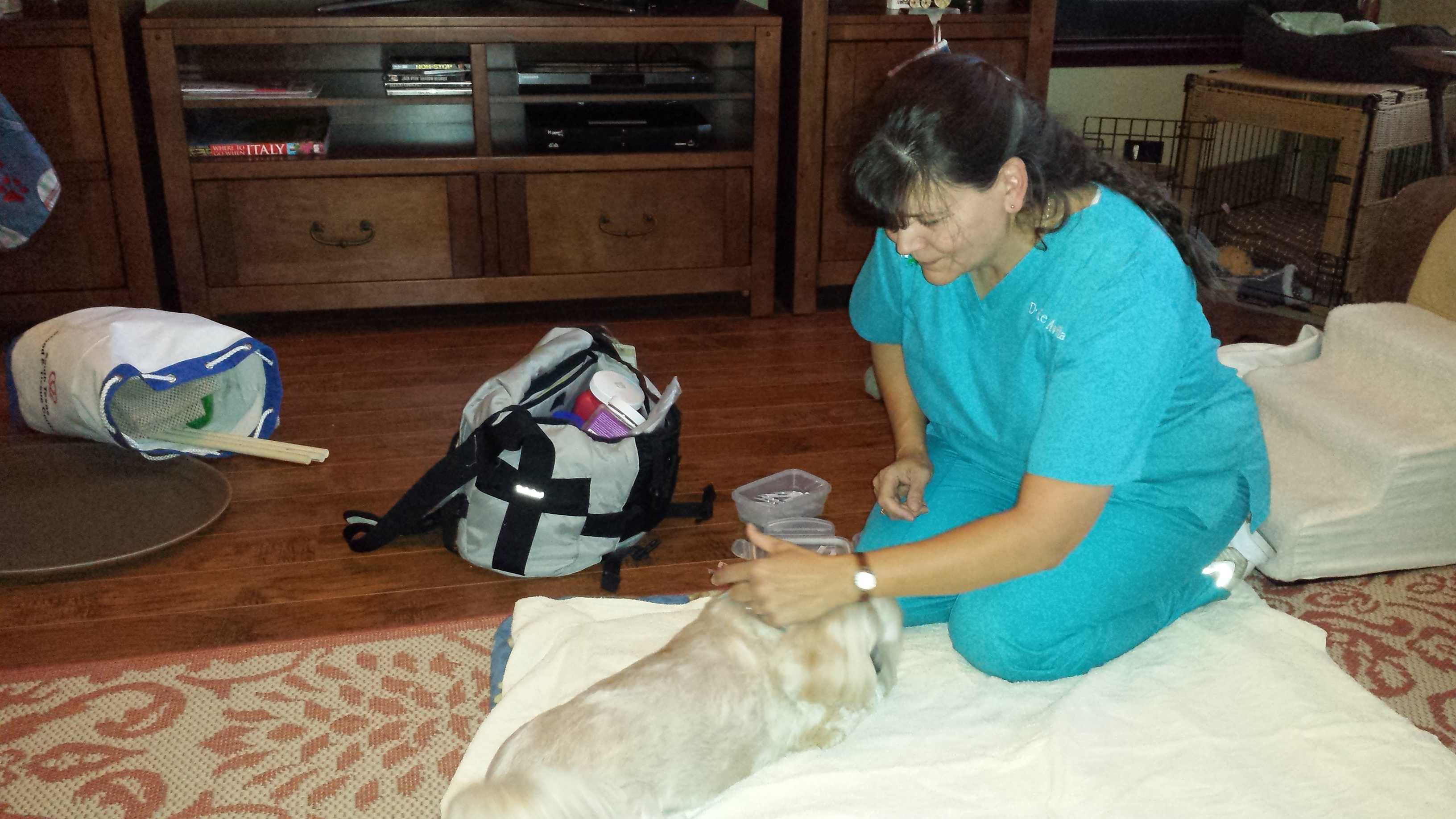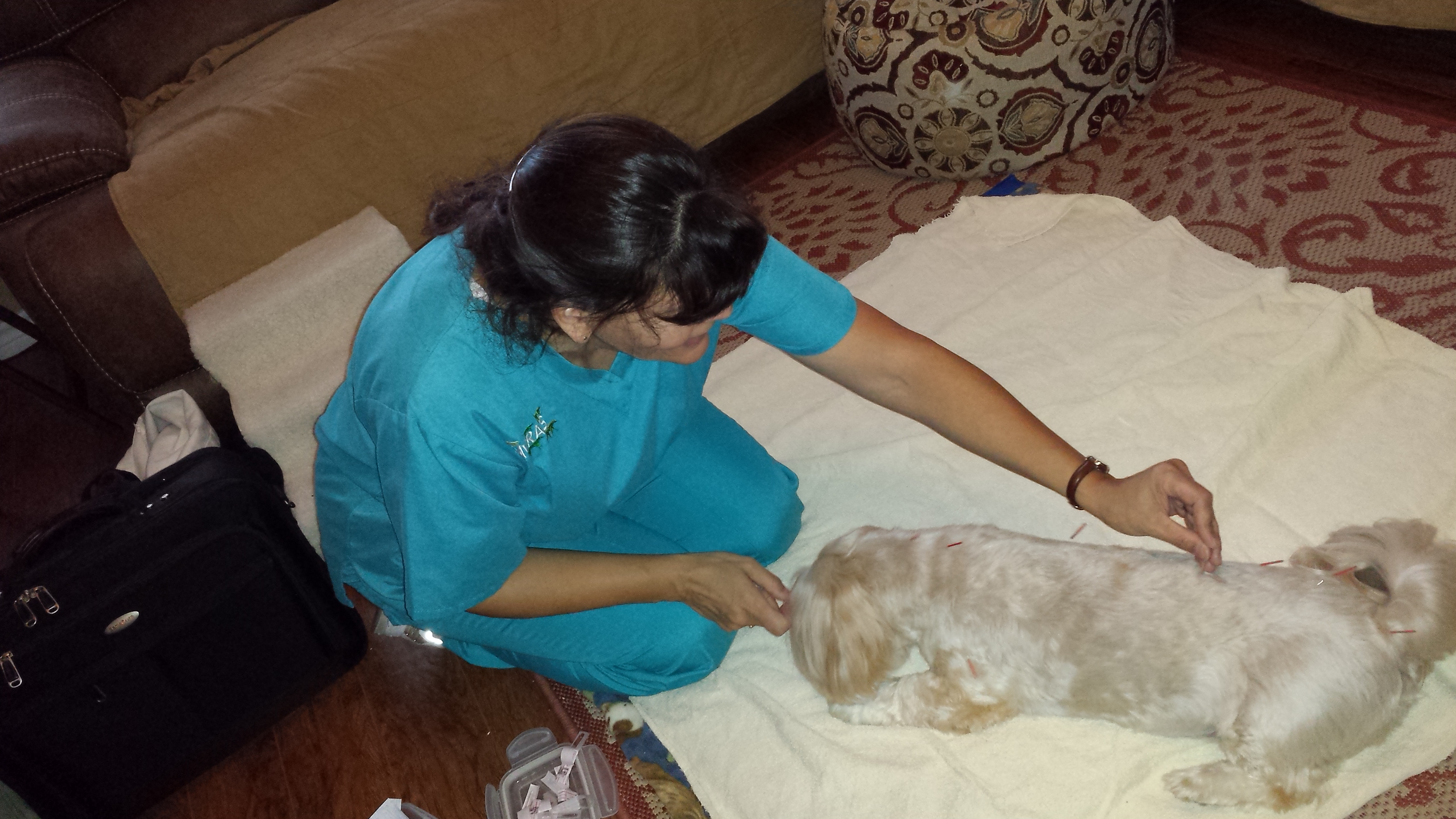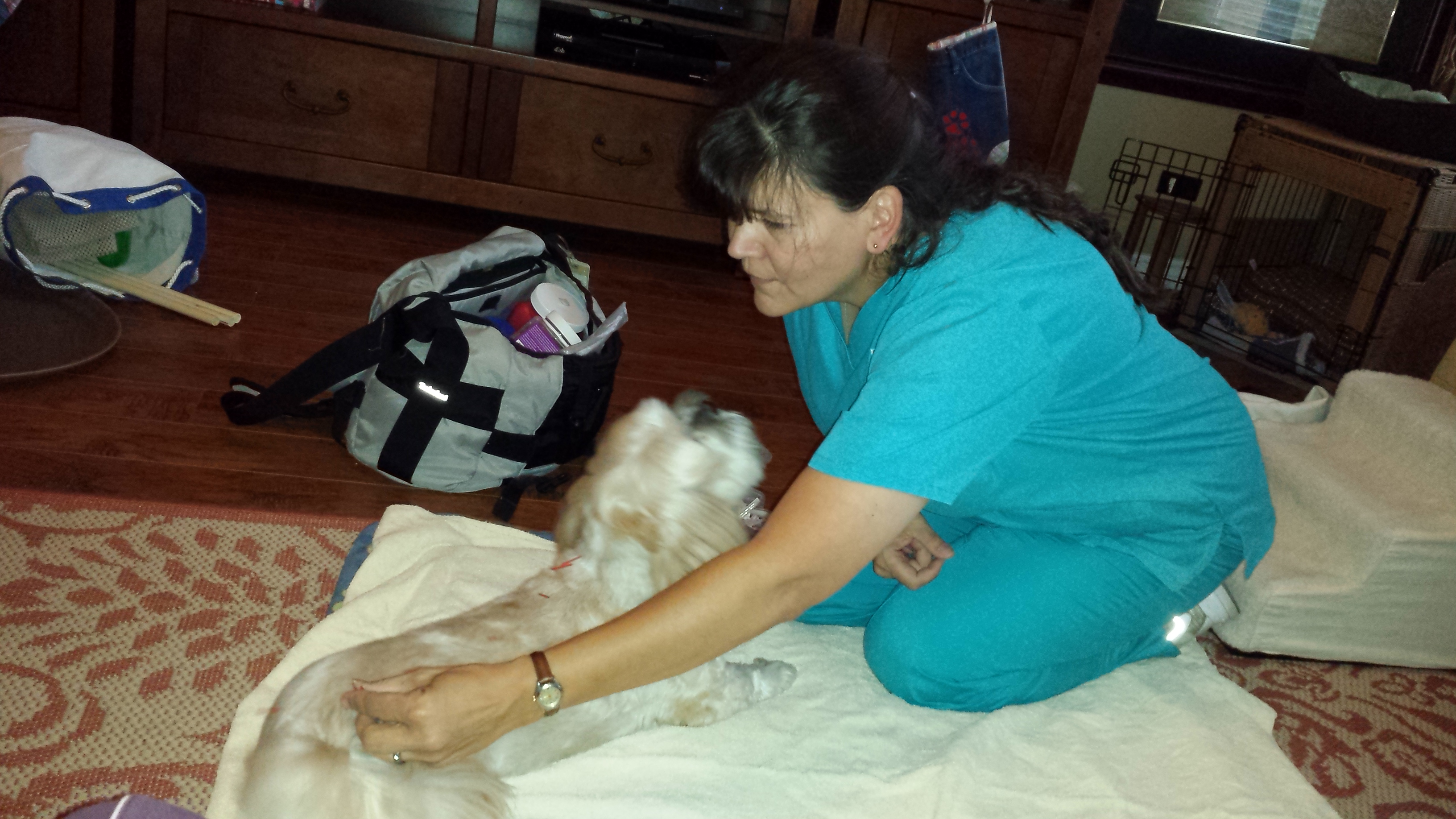 In early 2014 my veterinarian, Dr. Eric Schmeltzer of O’Connor Road Animal Hospital in San Antonio, Texas, referred me to a mobile acupuncturist, Dr. Kelly Avila with Mobile Veterinary Rehabilitation & Acupuncture Service (MVRAS) who offers in-home physical rehab and acupuncture services for cats and dogs. I contacted her and made an appointment.