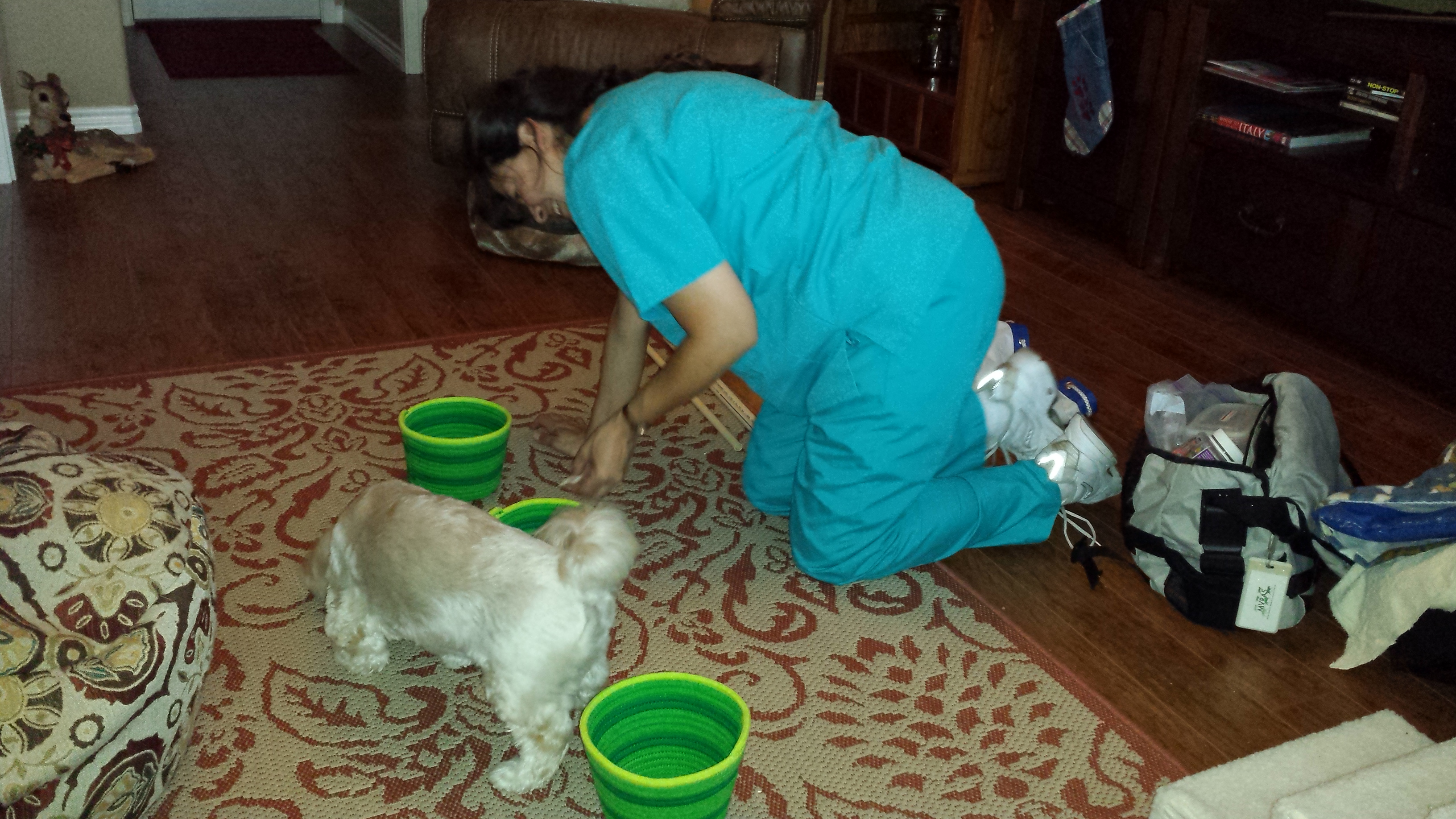 Dr. Avila assessed Yeti’s pain, his regular routines and movement. I have to admit, I’ve never seen acupuncture therapy up close. I was amazed how she could distract Yeti with treats long enough for her to place the little needles down his spine and on his shoulders. He never knew he was actually being treated. After the needles were removed, she then began to use laser therapy all over his body, all the while dispensing treats so Yeti was distracted. Next, Yeti was given several different physical rehab exercises that would help him stretch and build strength in his muscles.